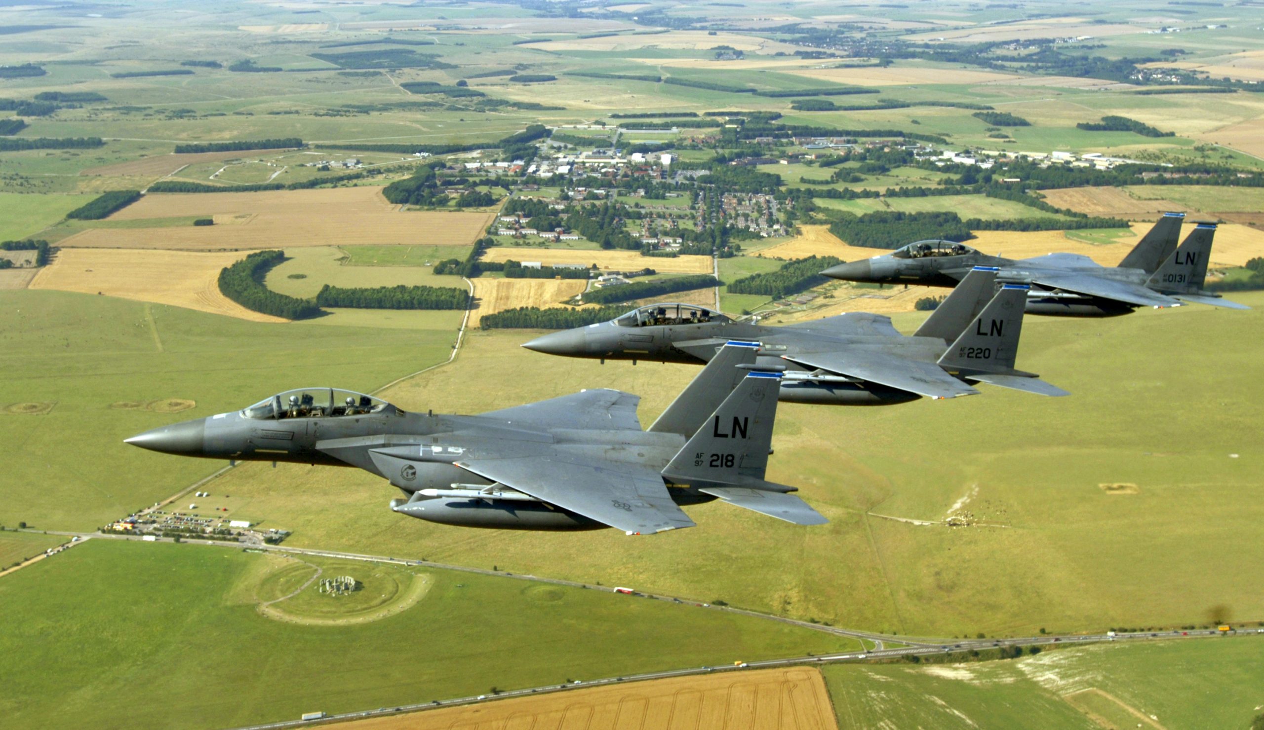 A trio of F-15E Strike Eagles flies past Stonehenge, England, during a training flight from Royal Air Force Lakenheath, England, on Thursday, Aug. 3. The fighters, of the 492nd Fighter Squadron ÒMadhatters,Ó went to an area off the southwestern coast of England to practice basic surface attack techniques. This training mission enhances the aircrewÕs air-strike skills without the need to drop bombs or shoot their 20 mm cannon. (U.S. Air Force photo/Master Sgt. Lance Cheung)