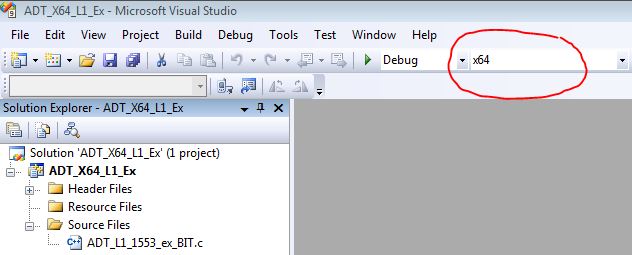 The image below shows a proper Debug/x64 project in the MS Studio status bar.